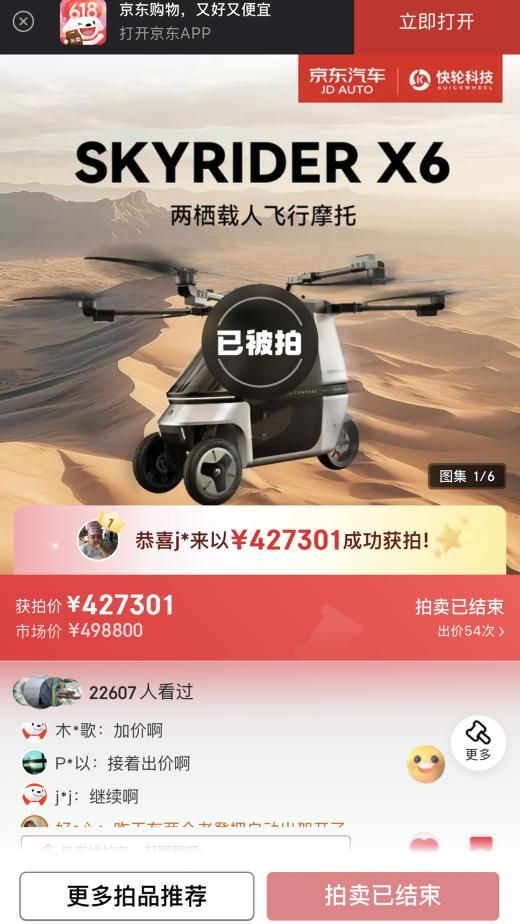 同日,快輪飛行摩托Skyrider X6登錄京東拍賣平臺,經過4小時、54輪的持續(xù)競價,最終以人民幣42.73萬元的價格成交。