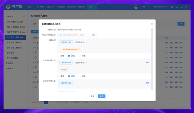 標簽自由運算”:支持抖音公域人群(官方推薦人群、競品人群)與私域人群(品牌客戶分組)的 “疊加、篩選、排除” 組合運算,實現(xiàn)標簽數(shù)據互補;