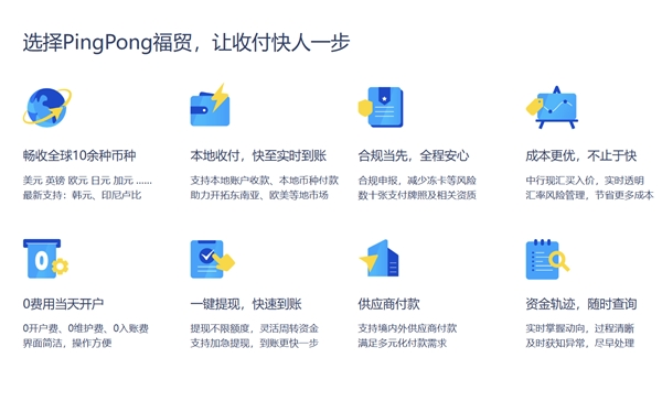 此外,對于從事外貿(mào)出口業(yè)務(wù)的企業(yè)來說,如何高效、安全、低成本收取訂單款項(xiàng)也是生意能否做大做強(qiáng)的關(guān)鍵。相比傳統(tǒng)的T/T電匯,PingPong旗下的外貿(mào)B2B收付款產(chǎn)品——福貿(mào)擁有多國本地賬戶的優(yōu)勢:首先是成本低,因?yàn)門/T打款一般情況下付費(fèi)基本上在50美金一單,有的時(shí)候中間行多一些,甚至可能到100美金、200美金,同時(shí)時(shí)效也很難保證,銀行一般會(huì)告知2-7個(gè)工作日內(nèi)到賬。并且PingPong福貿(mào)提供的多國本地賬戶基本沒有轉(zhuǎn)賬費(fèi);第二是用海外本地清算系統(tǒng),類似于中國企業(yè)直接通過銀聯(lián)轉(zhuǎn)賬,結(jié)算效率也會(huì)更高,大部分付款能當(dāng)天到賬。
