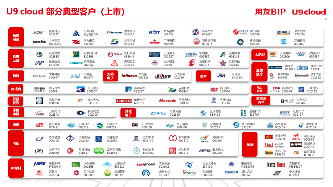 從企業(yè)數(shù)智化轉(zhuǎn)型的實(shí)踐來(lái)看,U9 cloud不但能夠?yàn)橹圃炱髽I(yè)的IPO保駕護(hù)航,而且在裝備制造、機(jī)械、電子、汽配和新材料等許多行業(yè)也有著大量上市公司的最 佳實(shí)踐。