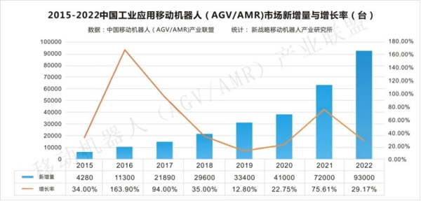 2022年,中國首次進入人口負增長時代,工業(yè)應用移動機器人逆勢而上。根據(jù)CMR產(chǎn)業(yè)聯(lián)盟統(tǒng)計,該年中國應用移動機器人(AGV/AMR)總銷量為93000臺,較2021年增長29.17%,市場銷售額達185億元,同比增長46.82%。