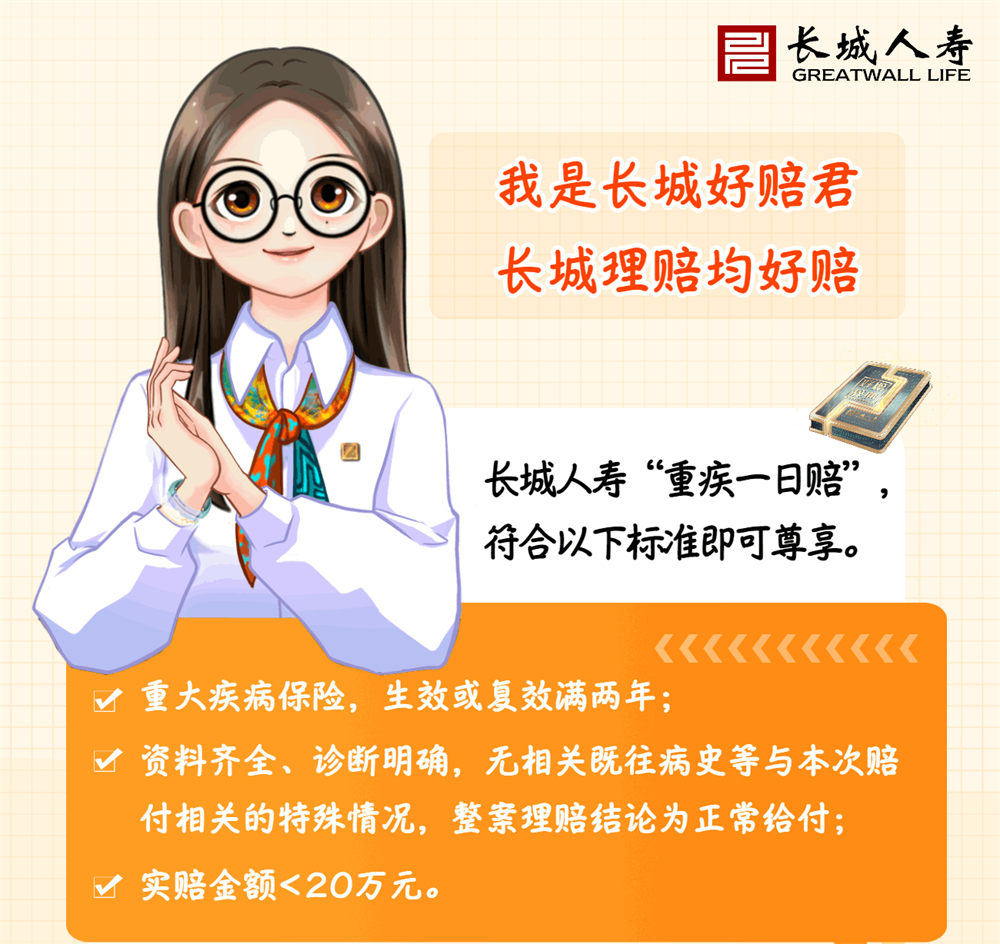 2022年,長(zhǎng)城人壽在行業(yè)首創(chuàng)、重磅打造以真實(shí)理賠員為原型的理賠服務(wù)形象“好賠君”,同步推出理賠服務(wù)舉措“重疾一日賠”,傳遞“好專業(yè)、好便捷、好溫馨”的服務(wù)理念,受到業(yè)界及市場(chǎng)的認(rèn)可。
