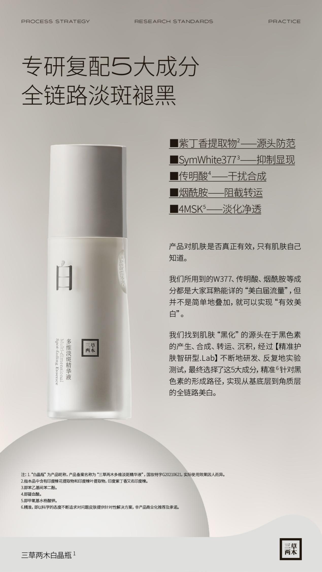 在經(jīng)過三草兩木“精準(zhǔn)護(hù)膚智研型.Lab”不斷研發(fā)、反復(fù)實(shí)驗(yàn)、測(cè)試改進(jìn)后,最終選擇了紫丁香提取物、SymWhite377、傳明酸、煙酰胺、4MSK為五大核心成分,從源頭防范、抑制顯現(xiàn)、干擾合成、阻截轉(zhuǎn)運(yùn)、淡化凈透入手來實(shí)現(xiàn)全鏈路淡斑褪黑,達(dá)到精準(zhǔn)及真正有效的美白效果。并且團(tuán)隊(duì)深知:W377、傳明酸、煙酰胺等成分可謂是大家耳熟能詳?shù)摹懊腊讓昧髁俊?,但這些成分并不是簡(jiǎn)單疊加起來就能實(shí)現(xiàn)“有效美白”,成分的含量、安全性及純度等,都對(duì)美白效果起著至關(guān)重要的作用。正是經(jīng)過長(zhǎng)時(shí)間不斷地調(diào)試,三草兩木白晶瓶才最終誕生,并且在各方面均達(dá)到或超過研發(fā)團(tuán)隊(duì)預(yù)期效果,成為一款真正意義上的“美白利器”。