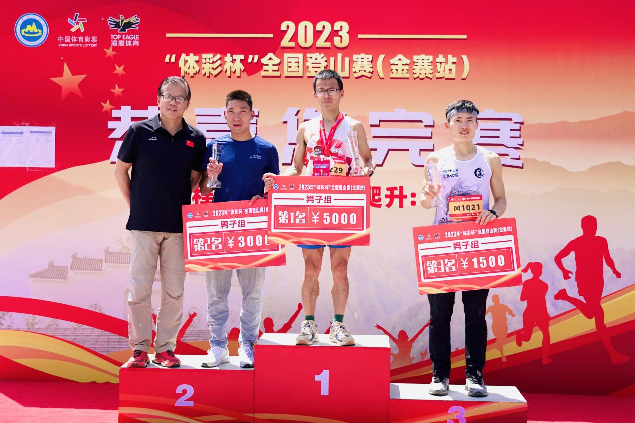 ◎中國登山協(xié)會(huì)副秘書長羅申為男子組前三名頒獎(jiǎng)
