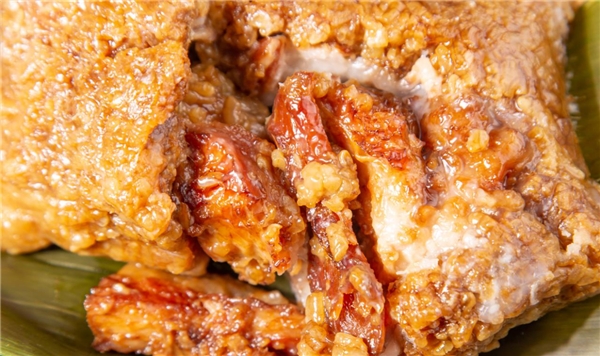 每一個粽子足足有半斤重,聽老板說粽子是小火慢燉6小時,然后再燜煮2小時才出鍋。我運氣正好,正好趕上了老板新鮮出鍋的粽子,老遠就味道了粽香味,老板見我饞得不行,拿了個讓我吃吃看。