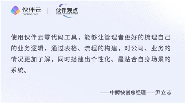尹立志:員工會(huì)覺得,面對(duì)面就可以簽字,審批,為什么要花時(shí)間去上系統(tǒng)呢?用來搭建系統(tǒng)的時(shí)間,可以去做很多其他的事情。這就需要面臨取舍。很多員工包括高管,都沒有了解到零代碼工具已經(jīng)進(jìn)化到了很便捷的狀態(tài),搭建之后可以一勞永逸地解決很多問題。