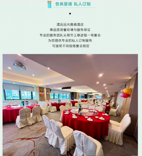 清遠遠光雅閣酒店(雅閣酒店集團旗下成員酒店),推出謝師宴,優(yōu)雅的環(huán)境、豐盛的美味、貼心周到的服務(wù),為您締造美好回憶。
