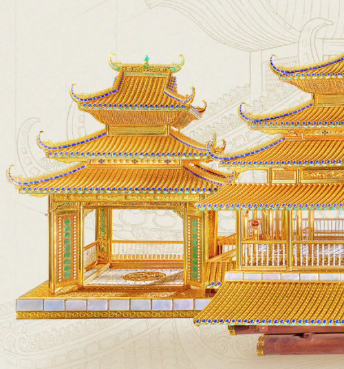侗族風(fēng)雨橋,因其廊亭可遮風(fēng)擋雨得名,她巧妙地連接兩岸,庇護(hù)過客,讓族人在橋下納涼、休憩,具有深厚的建筑營造技巧和文化積淀?!帮L(fēng)雨橋”是漢族人予它的名字,侗族人喜歡稱呼它為“福橋”,意指“賜予幸福吉祥之橋”。承載著福氣和功德的“福橋”。而潮宏基珠寶的花絲風(fēng)雨橋,則擷取風(fēng)雨橋的建筑結(jié)構(gòu)之美與庇佑祥瑞之意,歷時四年多復(fù)刻而成。