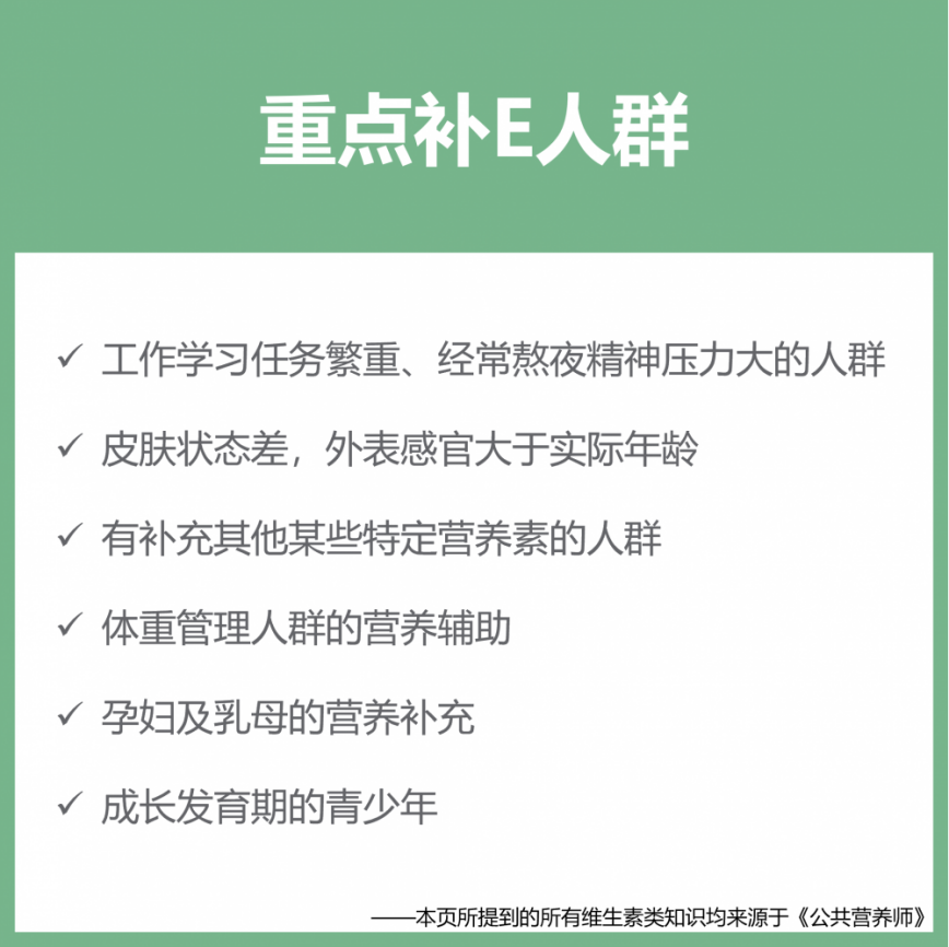 然而,我們也需要注意維生素E的適度攝入。根據(jù)《中國居民膳食指南》,每日所需的維生素E攝入量為13-14毫克,適用于11歲以上青少年、18歲以上成年人、50歲以上中老年人,包括孕婦和乳母。