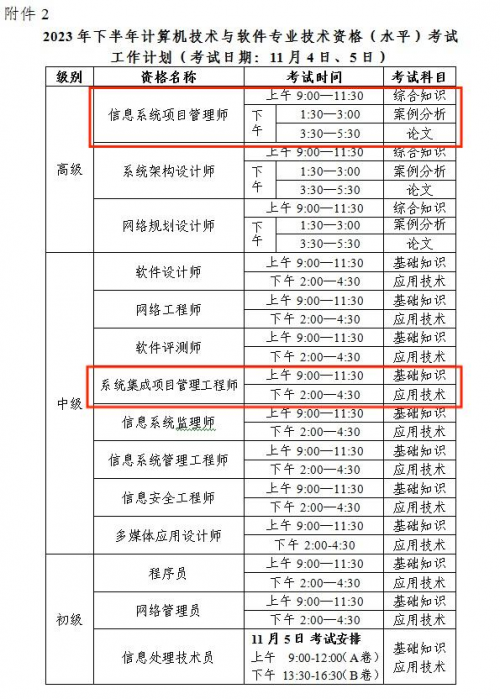 根據(jù)軟考辦發(fā)布的《關(guān)于2023年度計算機(jī)技術(shù)與軟件專業(yè)技術(shù)資格(水平)考試工作計劃及有關(guān)事項的通知》可以得知,2023年下半年軟考考試時間為11月4、5日,具體如下表所示: