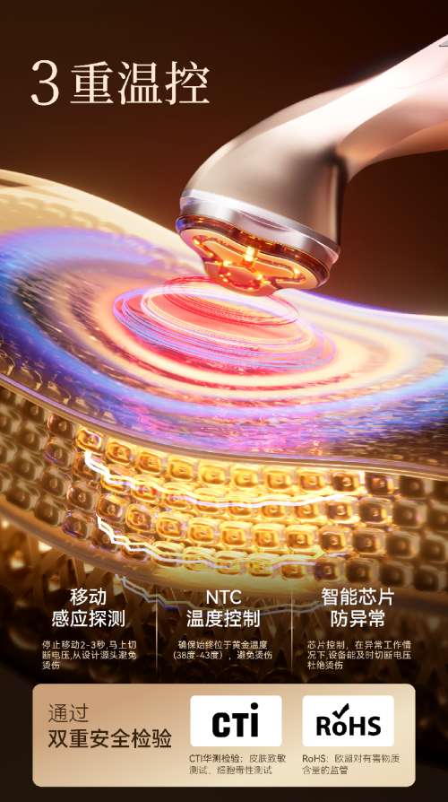 相比于其他美容儀的溫控系統(tǒng),玉如意美容儀還有三重安全保護:移動感應探測功能、NTC溫度控制和芯片控制,確保美容儀時刻維持黃金溫度(38-43度),杜絕燙傷,讓用戶居家使用更安心。