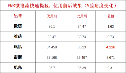 從以上數(shù)據(jù)可以看出,不同品牌美容儀的EMS微電流提拉效果不同,其中珮肌玉如意使用后的效果較為明顯,臉部輪廓可以瞬時提升4度。