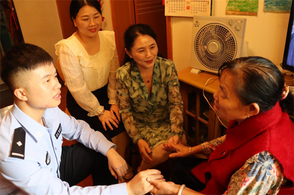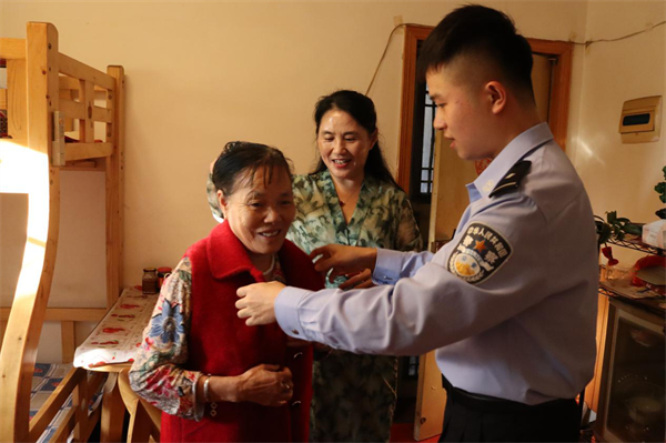 彭惠珍部長(zhǎng)與干警肖宇軒為老人穿上新衣(攝影吳世龍)