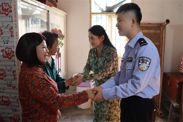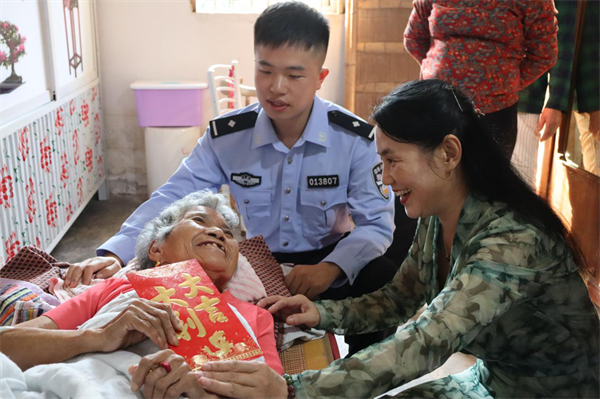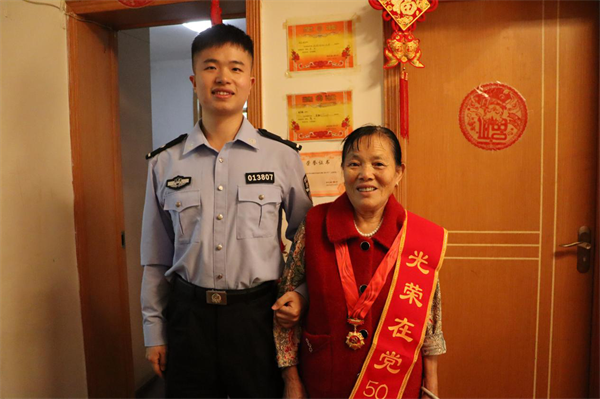 干警肖宇軒與佩戴光榮在黨50年紀(jì)念章的老人合影