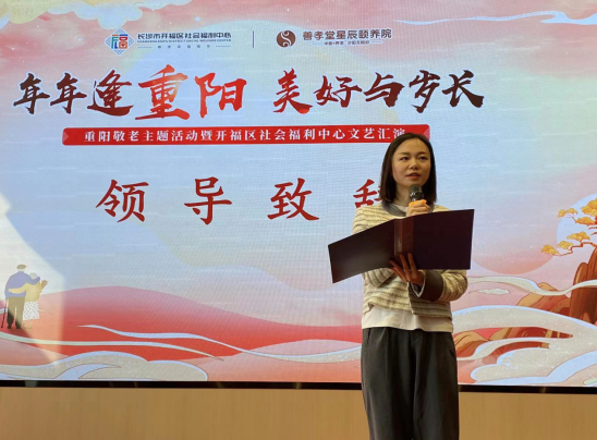 善孝堂養(yǎng)老副總經(jīng)理周蓉發(fā)表致辭,表示尊老、敬老、愛老、養(yǎng)老是中華民族的傳統(tǒng)美德,源遠流長,開福區(qū)社會福利中心作為開福區(qū)公建民營普惠養(yǎng)老機構(gòu),承載著民生福祉,我們將時刻把老年人的衣食冷暖放在心上、抓在手上,為老年人提供更優(yōu)質(zhì)更貼心的服務(wù),滿足老年人多元化、個性化的晚年生活需求。