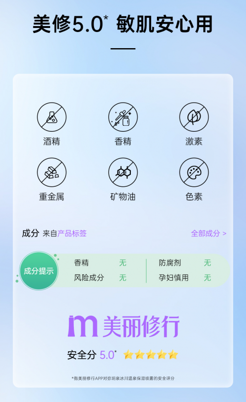 作為彌玥泉家的王牌產(chǎn)品,「冰川溫泉保濕噴霧」的用料可以說(shuō)是非常舍得,采用100%天山冰川溫泉水配方,兼顧補(bǔ)水、保濕、修護(hù)、舒緩的同時(shí),舍棄了酒精、香精、防腐劑等各種添加劑,產(chǎn)品溫和到美麗修行都給了5.0的安全評(píng)分,上臉主打一個(gè)安心。