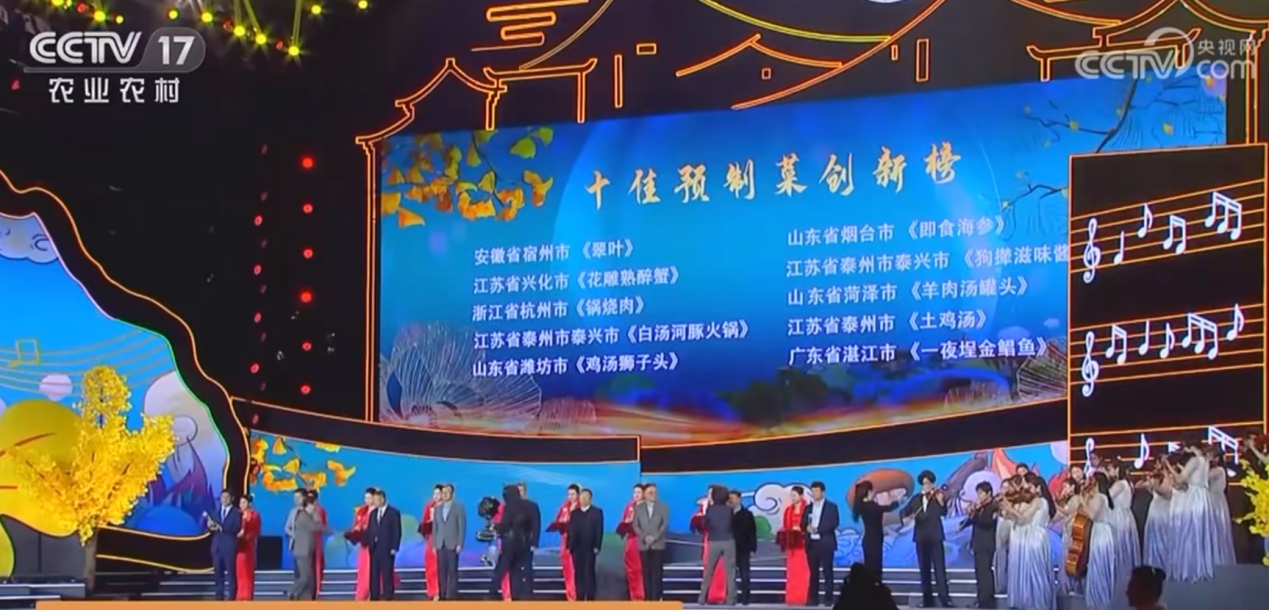 11月9日,由中央廣播電視總臺農業(yè)農村節(jié)目中心聯(lián)合央視頻推出的全國首屆《預制菜爭霸賽》頒獎盛典在江蘇泰州泰興盛大開幕。大賽總共343道菜品參賽,來自20多個省、自治區(qū)、直轄市的324家企業(yè),從還原度、健康性、方便性、創(chuàng)新性四個維度評選出“十佳預制菜美味榜”“十佳創(chuàng)新預制菜榜”“我最喜愛的預制菜榜”。其中,來自廣東湛江的“一夜埕金鯧魚”榮登“十佳預制菜創(chuàng)新榜”,還榮獲“我最喜愛的預制菜”稱號。