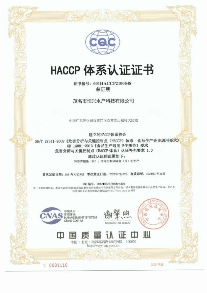 HACCP體系認證證書
