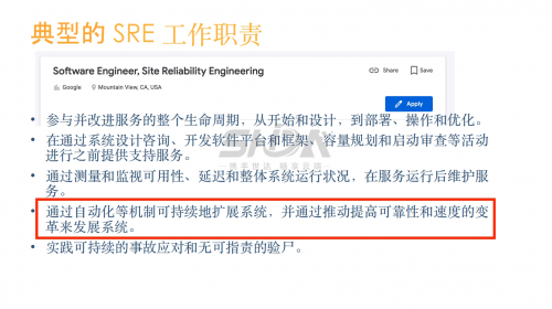 SRE是運(yùn)維向運(yùn)維研發(fā)的拓展,運(yùn)維去擁抱開發(fā),運(yùn)維的人員需要具備一定的開發(fā)能力,適用于國(guó)內(nèi)廣泛的運(yùn)維部門轉(zhuǎn)型。SRE介紹了通過(guò)自動(dòng)化、工作方法和組織重組的混合措施來(lái)提高服務(wù)可靠性的一系列實(shí)踐。SRE Foundation是為那些關(guān)注大規(guī)模服務(wù)可用性的學(xué)員量身定制的課程。