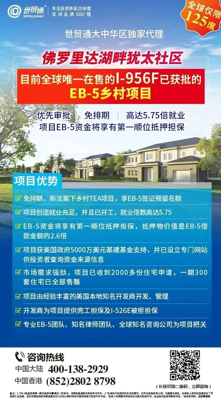 此外,由世貿(mào)通擔(dān)任大中華區(qū)獨(dú)家代理的,I-956F已獲批的「佛羅里達(dá)湖畔猶太社區(qū)」EB-5鄉(xiāng)村項(xiàng)目,同樣是投資者快速移民美國(guó)的明智之選。該項(xiàng)目集免排期、優(yōu)先審理、項(xiàng)目就業(yè)倍數(shù)高達(dá)5.75、EB-5資金將享有第 一順位抵押擔(dān)保、最短投資期僅3年等諸多優(yōu)勢(shì)于一身,為投資者提供了快速獲得美國(guó)綠卡的上佳機(jī)會(huì)!可遇不可求的優(yōu)質(zhì)鄉(xiāng)村EB-5項(xiàng)目,經(jīng)過(guò)一輪又一輪的搶購(gòu)之后,僅剩少量名額,好項(xiàng)目不等人,有意向者認(rèn)購(gòu)須從速!