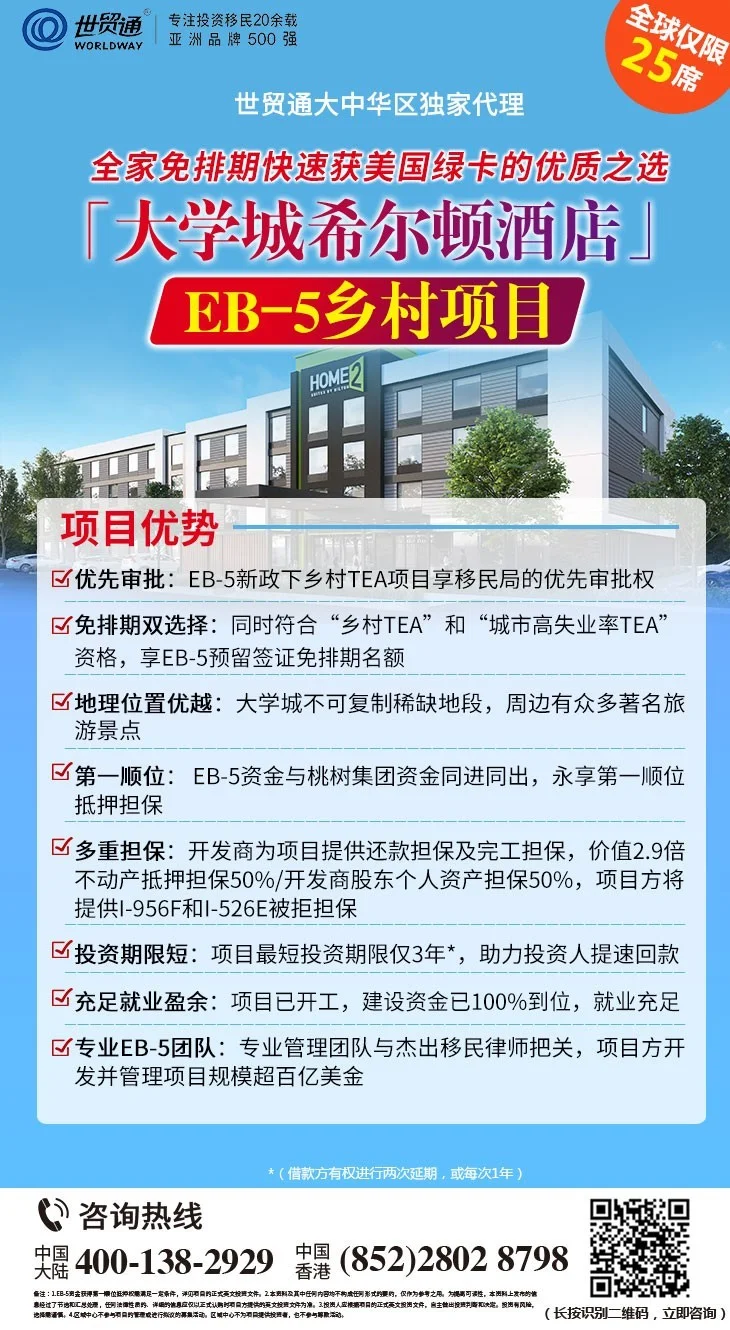 由世貿(mào)通集團(tuán)擔(dān)任大中華區(qū)獨(dú)家代理的「大學(xué)城希爾頓酒店」EB-5鄉(xiāng)村項(xiàng)目,具有優(yōu)先審批、免排期、價(jià)值2.9倍不動(dòng)產(chǎn)抵押擔(dān)保50%/開(kāi)發(fā)商個(gè)人資產(chǎn)擔(dān)保50%、EB-5資金與桃樹(shù)集團(tuán)同進(jìn)同出,永享第 一順位抵押擔(dān)保、大學(xué)城不可復(fù)制稀缺地段、最短投資期僅3年、同時(shí)符合“鄉(xiāng)村TEA”和“城市高失業(yè)率TEA”資格等多重優(yōu)勢(shì),項(xiàng)目全球僅限25席,名額不多,有意向者認(rèn)購(gòu)需從速!