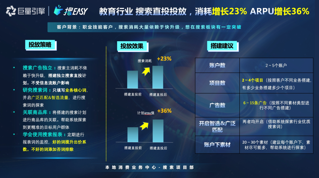 首先,結(jié)合行業(yè)特點明確搜索主消耗不再依賴信息流投放和搜索投放的打包,而是直接搭建獨立搜索直投計劃,讓搜索投放不再受信息流賬戶影響。這個決策幫助它快速提升了搜索消耗,搭建直投后的消耗量相較直投前提升了23%。