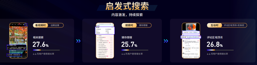 以抖音為例,平臺用戶日均搜索次數(shù)已經(jīng)達到3次,接近六成的用戶在打開APP后的30秒內(nèi)會進行搜索,而沒有在抖音內(nèi)使用過搜索的用戶占比現(xiàn)在僅有6%。