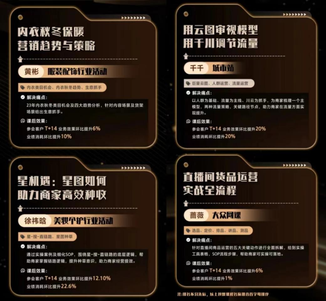 在榜單中,有針對美妝個護(hù)、服裝配飾、日化母嬰、食品飲料、3C電器等大眾消費(fèi)五大行業(yè)的垂直課程,也有來自大眾網(wǎng)課、城市站、巨量華佗等全行業(yè)項目的通識課程,其內(nèi)容涵蓋了直播、短視頻、人群運(yùn)營、貨品運(yùn)營等經(jīng)營策略,以及巨量千川、巨量云圖、巨量星圖等產(chǎn)品進(jìn)階攻略。