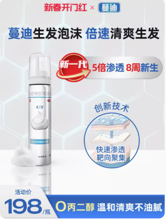 在消費者頗為關心的產(chǎn)品價格方面,“蔓迪泡沫劑”的活動價為198元/瓶,規(guī)格為60g/瓶,產(chǎn)品批準文號:國藥準字H20234731。作為一款全新升級的生發(fā)類產(chǎn)品,該產(chǎn)品的定價也頗具市場競爭力,讓更多消費者用合理的價格享受到更好的產(chǎn)品。