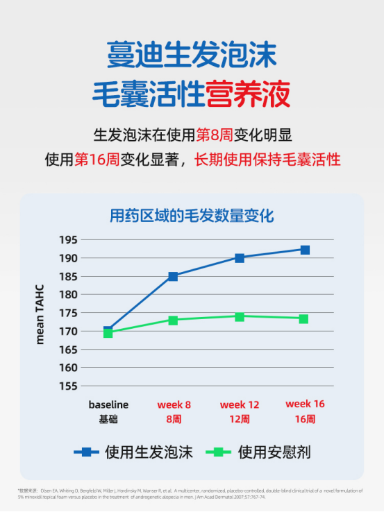 優(yōu)勢三:準確給藥。傳統(tǒng)的溶液劑易揮發(fā),擦在頭皮上易析出結晶,影響藥物吸收。蔓迪泡沫劑中米諾地爾穩(wěn)定性更高,且具有不易揮發(fā)的特點,可以幫助提升藥物使用效果,并做到準確給藥。