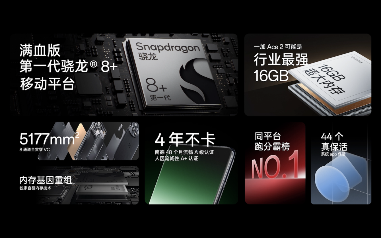 一加 Ace 2為用戶帶來同價位段前所未見的性能釋放:搭載滿血版驍龍8+ 移動平臺 + LPDDR5X + UFS3.1的組合,安兔兔跑分高達(dá) 1149494 分,刷新驍龍8+ 移動平臺最 高紀(jì)錄。內(nèi)存配置上,一加 Ace 2繼續(xù)堅(jiān)持“大內(nèi)存普及”思路,12GB+256GB 起步,至高支持 16GB+512GB,性能釋放領(lǐng) 先一步。配合獨(dú)家自研的內(nèi)存基因重組技術(shù),一加 Ace 2 重負(fù)載場景丟幀次數(shù)降低 50%,后臺應(yīng)用駐留最多達(dá) 44 個,后臺駐留能力成為同平臺第一。同時,一加 Ace 2 還獲得南德 48 個月 A 級流暢認(rèn)證及 SGS 人因流暢性 A+ 認(rèn)證。