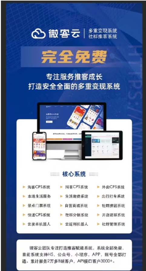 微客云 隸屬于南京言午網(wǎng)絡(luò)科技有限公司,于2014年開(kāi)始做淘寶客這一塊,致力于成為專業(yè)、安全淘寶客程序提供商。旗下產(chǎn)品包含基礎(chǔ)版CMS、團(tuán)隊(duì)版CMS、小程序和原生態(tài)APP、外賣返利系統(tǒng),抖音返利系統(tǒng),生活繳費(fèi)系統(tǒng),出行CPS,會(huì)員權(quán)益等功能。搭建私域營(yíng)銷系統(tǒng) 打造私域運(yùn)營(yíng)閉環(huán) 迅速實(shí)現(xiàn)多重變現(xiàn)完全免費(fèi)。