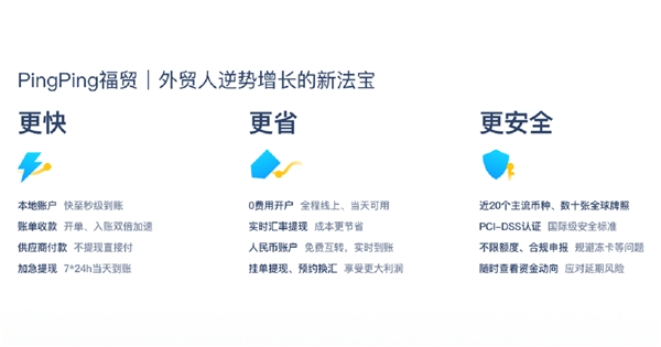 福貿(mào)作為PingPong旗下的一站式外貿(mào)收款產(chǎn)品,具備專業(yè)、安全、靈活、高效等優(yōu)勢(shì)特點(diǎn)。