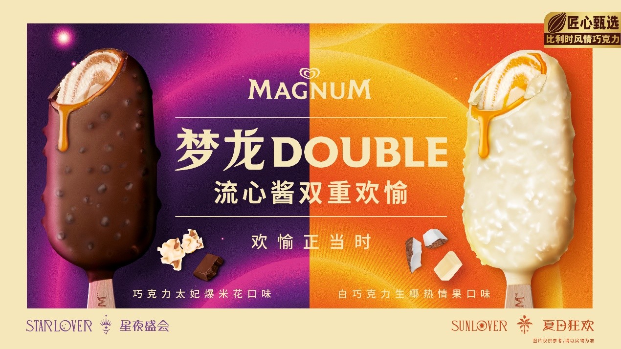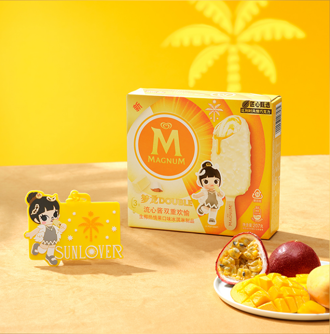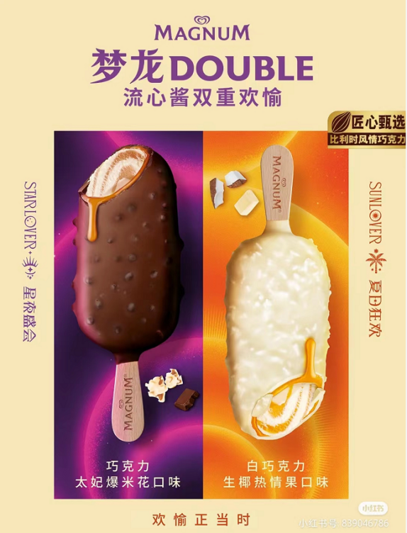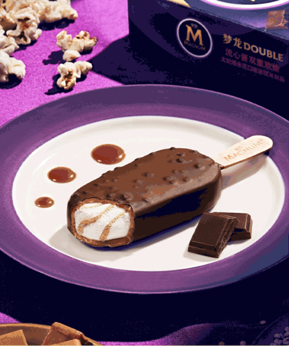 這次的夢(mèng)龍全新日夜CP與此前推出的日夜CP不同的是,這次的夢(mèng)龍雪糕里面包裹著濃郁的流心醬。屬于白天的夢(mèng)龍DOUBLE生椰熱情果口味冰淇淋里面融合了熱情果芒果流心醬,口感酸酸甜甜,頗具特色;屬于黑夜的太妃爆米花口味冰淇淋則搭配了海鹽焦糖風(fēng)味流心醬,口感咸甜,個(gè)性十足。