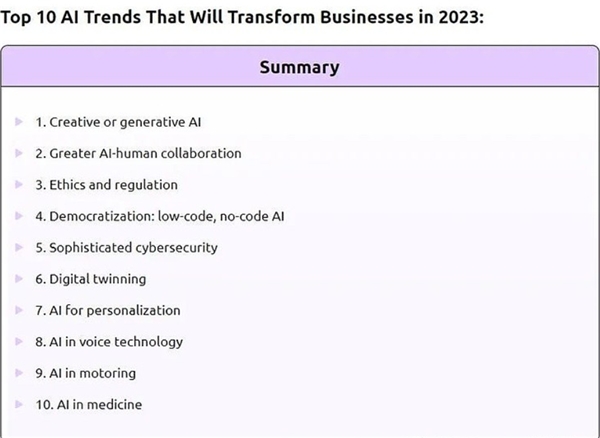 AIGC,即Artificial Intelligence + General Computing,是人工智能和通用計算相結(jié)合的新一代技術(shù)。科技媒體Influencer發(fā)布了《2023年將改變企業(yè)的10大AI趨勢》報告顯示,在影響企業(yè)工作效率、洞察力和客戶體驗的10大AI技術(shù)中,排名第 一的是AIGC(國外叫AGI),第四的是低代碼、零代碼開發(fā)應(yīng)用。