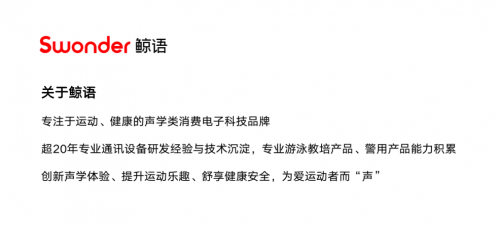 目前,鯨語骨傳導(dǎo)產(chǎn)品已涉及全國多個省市的水陸運動及專業(yè)教學(xué)領(lǐng)域,為水下工作群體、游泳、輪滑、馬術(shù)、足球、導(dǎo)游等多領(lǐng)域人群帶去更具創(chuàng)新性的骨傳導(dǎo)耳機體驗。隨著全民運動時代的來臨,基于多年專業(yè)防水教培類聲學(xué)產(chǎn)品積累,和防水、聲學(xué)、通訊領(lǐng)域?qū)I(yè)技術(shù)積累,鯨語品牌面向更廣泛的大眾運動人群推出鯨語Alpha,希望以更專業(yè)的技術(shù)能力與產(chǎn)品經(jīng)驗,打造專業(yè)防水骨傳導(dǎo)耳機新標(biāo)桿。