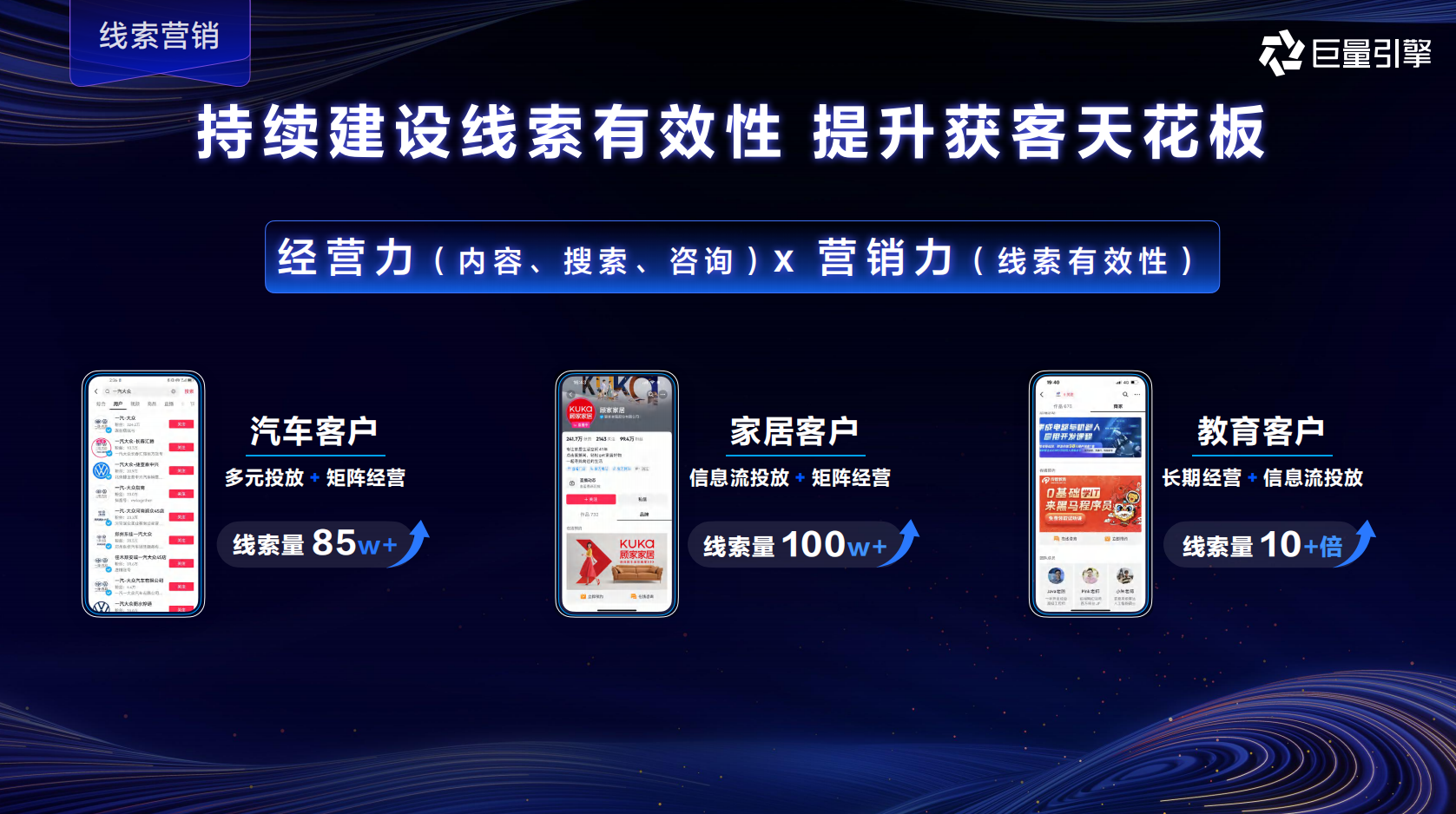 線索生意,是公認(rèn)的周期長(zhǎng)、渠道分散的復(fù)雜生意。巨量引擎圍繞內(nèi)容、搜索、咨詢?nèi)齻€(gè)最重要的環(huán)節(jié)建設(shè)經(jīng)營(yíng)能力,讓品牌商家通過自然經(jīng)營(yíng)就能獲得有效線索,讓每一條線索都更加真實(shí)有效。通過這些建設(shè),幫助品牌實(shí)現(xiàn)了高效的增長(zhǎng),比如幫助某車企客戶解決了傳統(tǒng)模式下獲客難、線索成本高的問題,實(shí)現(xiàn)全矩陣粉絲增長(zhǎng)和線索規(guī)模的快速提升;在家居行業(yè)合作中,也幫助家居品牌經(jīng)銷商擴(kuò)大開口,并搭配信息流和搜索投流加速轉(zhuǎn)化,比如通過持續(xù)建設(shè)線索的有效性持續(xù)幫助某家居品牌實(shí)現(xiàn)了全年獲得100w+線索的效果。