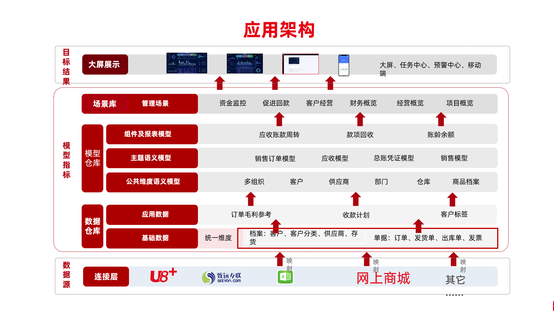 整個實施過程也是極其便捷的。第 一步,通過抓取U8+、OA、網(wǎng)上商城等系統(tǒng)的數(shù)據(jù),形成客戶、供應(yīng)商、存貨、單據(jù)類等基礎(chǔ)數(shù)據(jù),并進(jìn)一步轉(zhuǎn)化為應(yīng)用數(shù)據(jù);第二步,根據(jù)模型倉庫中的多組織模型、銷售訂單模型或報表模型等,搭建國洋自身需求的模型指標(biāo),并計算出結(jié)果,最終通過大屏、預(yù)警中心、移動端等呈現(xiàn)到管理者面前。