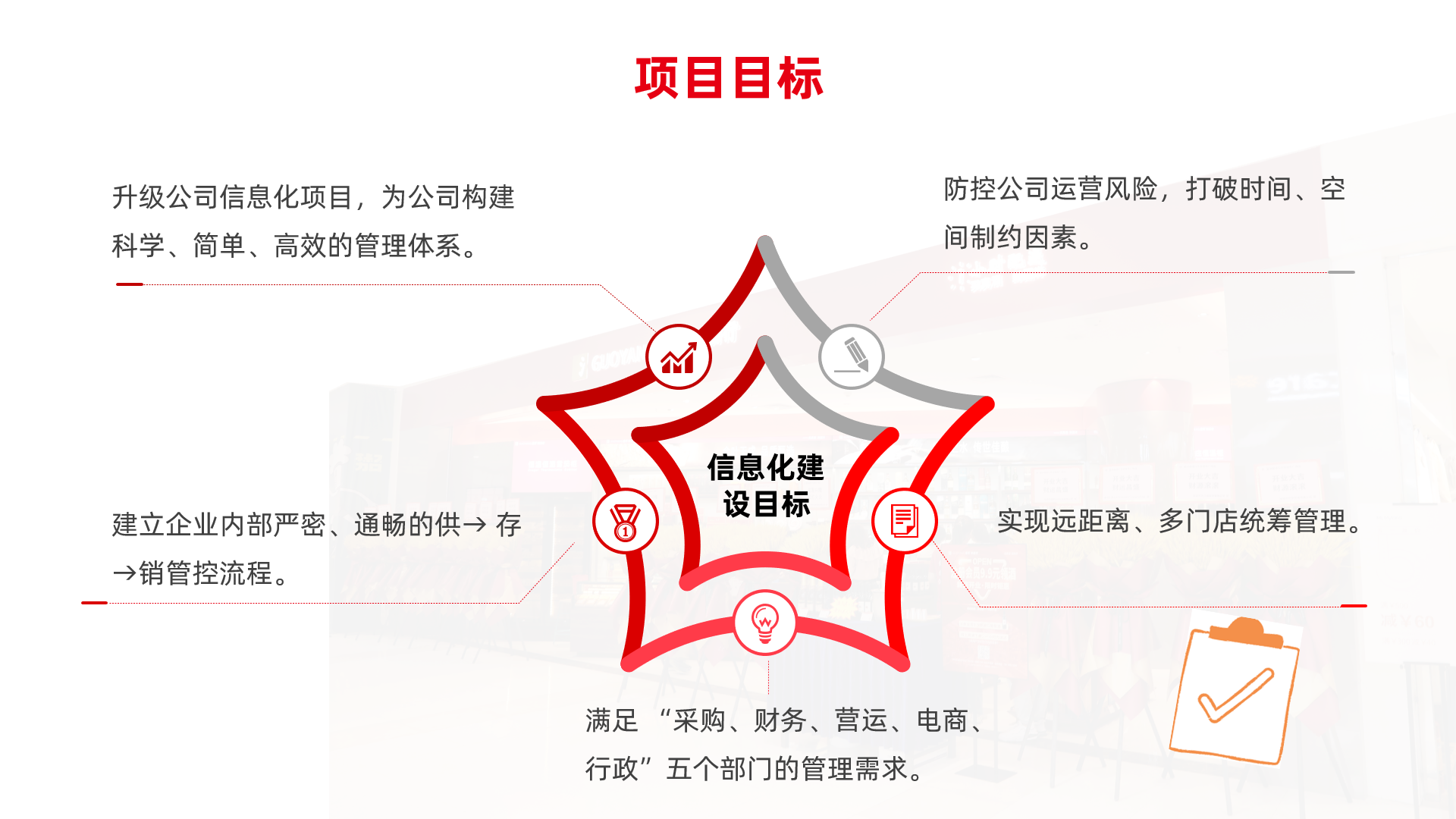 在這樣的窘境下,付國銀對企業(yè)數(shù)智化需求重新進(jìn)行了梳理和盤點,并制定了五大建設(shè)目標(biāo),即通過數(shù)智化平臺的建設(shè),滿足采購、財務(wù)、電商、行政等部門管理訴求;規(guī)范業(yè)務(wù)管理,建立標(biāo)準(zhǔn)化、一體化的供、存、銷管理流程;實現(xiàn)對所有門店的集中管控;加強移動化應(yīng)用,打造全面高效的決策支持體系,提高管理者的決策效率和準(zhǔn)確率;為企業(yè)構(gòu)建科學(xué)、有效的管理體系。
