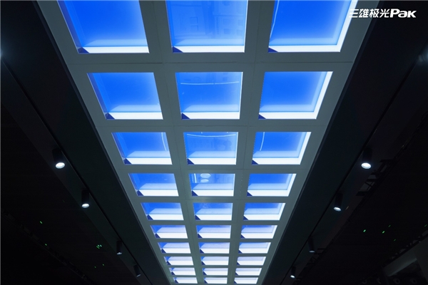 三雄極光展館設計別出心裁,兼顧觀賞性與功能性,創(chuàng)新宏大的形式帶來視覺震撼。展館頂部30臺CAF Lighting 蔚藍燈真實拼接遼闊青空,在人群涌動的室內(nèi)造就天空之境。場面之恢弘大氣,光線之柔美細膩,引來大批觀展者駐足抬頭仰看,再掀新一輪變革風暴。