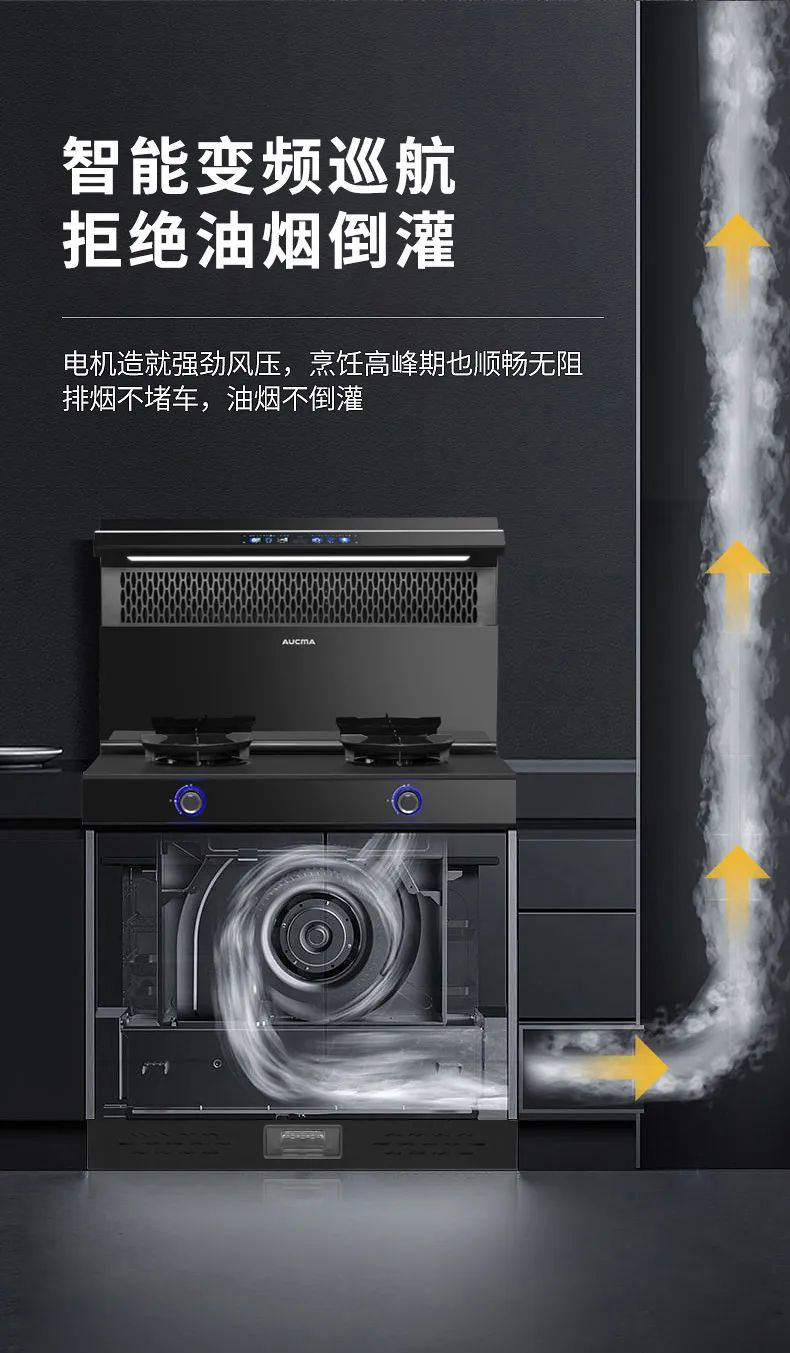 2. 智能變頻巡航系統(tǒng):無需手動開啟,當(dāng)遇到煙道擁擠油煙排不出去的情況時,會自動調(diào)節(jié)輸出風(fēng)壓大小,風(fēng)壓最 大可達900Pa,輕松排出油煙,無懼油煙倒灌。