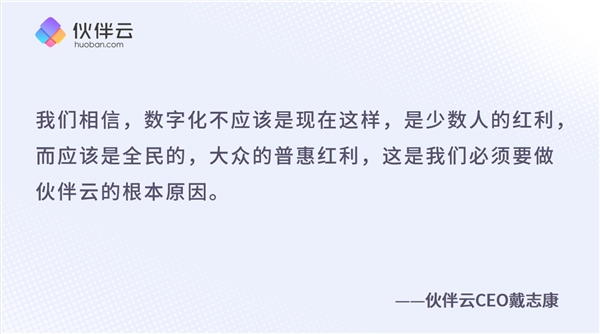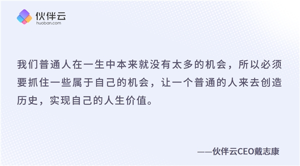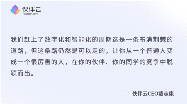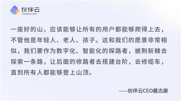 希望未來(lái),能夠和大家一起共創(chuàng),共同實(shí)現(xiàn)價(jià)值,把數(shù)字化、智能化的路趟平。讓那些在企業(yè)數(shù)字化中貢獻(xiàn)力量的人可以被看見(jiàn),可以被發(fā)掘,可以獲得成就,獲得升職加薪,獲得一個(gè)彎道超車(chē)的機(jī)會(huì)。我們相信,數(shù)字化不應(yīng)該是現(xiàn)在這樣,是少數(shù)人的紅利,而應(yīng)該是全民的、大眾的普惠紅利,這是我們必須要做伙伴云的根本原因。