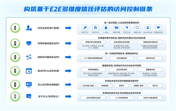 而零信任聚焦業(yè)務(wù)安全接入,從身份、終端、連接、權(quán)限、數(shù)據(jù)和行為等不同維度,幫助用戶安全訪問業(yè)務(wù),構(gòu)筑了基于端到端多維度信任評估的訪問控制鏈條。