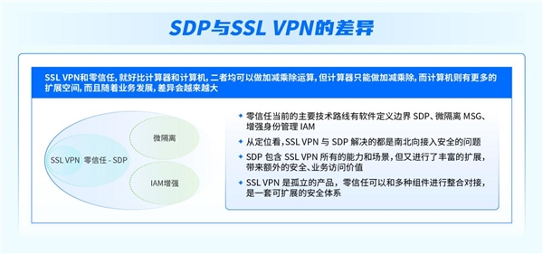 舉個例子來說,SSL VPN 和零信任,好比是計算器和計算機,二者都做數(shù)據(jù)運算,但計算器只能做加減乘除,而計算機有著更多的擴展空間,不論是能力擴展,還是場景擴展,都會存在差異,且隨著后續(xù)的發(fā)展,差異也會越來越大。