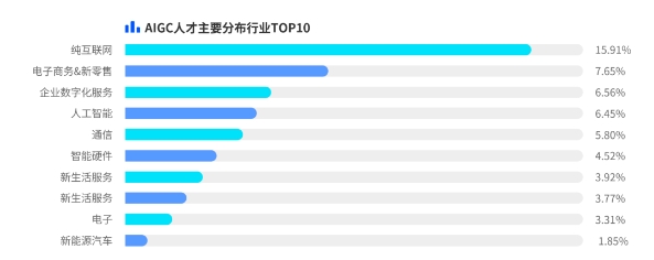 目前人工智能行業(yè)的AIGC?才保有量僅為6.45%,整體AIGC領(lǐng)域急需復(fù)合型?才,除專業(yè)要求外,NLP算法、深度學(xué)習(xí)、C++等詞?頻出現(xiàn),算法和編程功底是就職的硬性要求。AIGC領(lǐng)域?才分布于多個(gè)新經(jīng)濟(jì)行業(yè),其中純互聯(lián)網(wǎng)行業(yè)AIGC人才儲備量多。