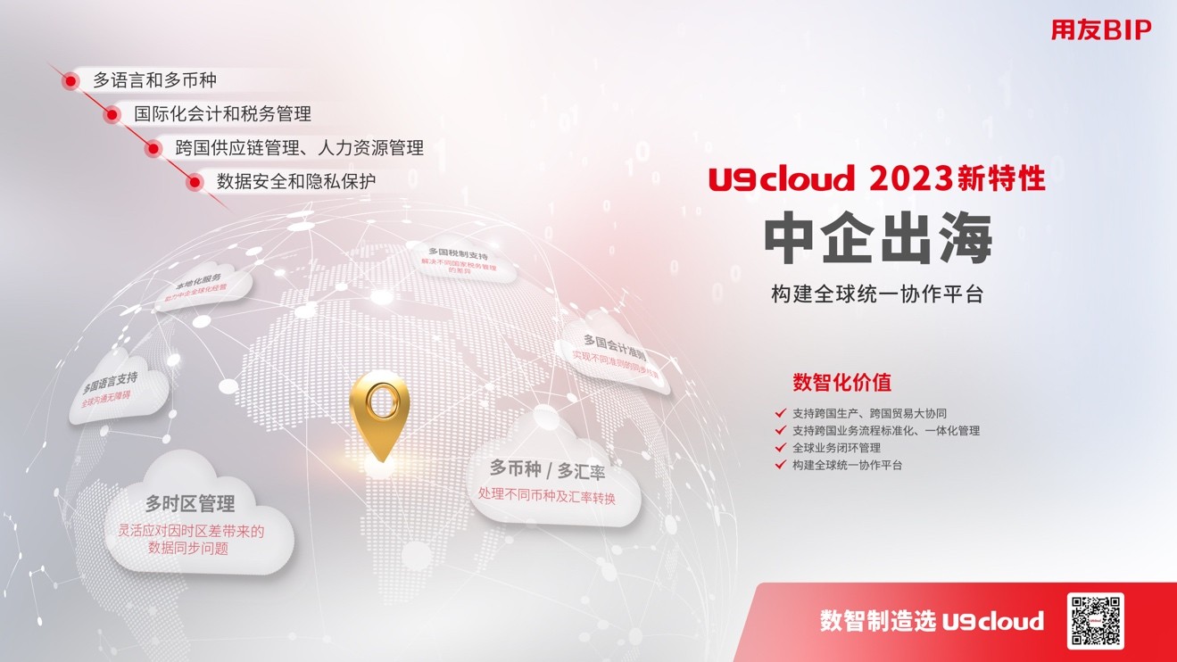 實際上,新發(fā)版的U9 cloud還重點強化了六大特性:數(shù)據(jù)驅(qū)動、行業(yè)深耕、智能工廠、精細管控、中企出海、隨需應變。其中隨著經(jīng)濟形勢的變化,中企出海無疑成了新的熱點。
