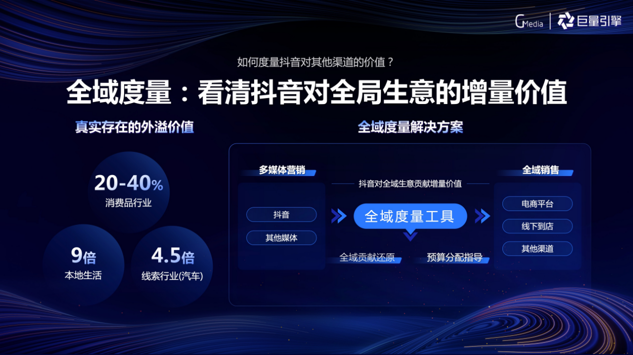 為了幫助品牌量化外溢價值,在全域經(jīng)營中找出“全局最 優(yōu)”的解題思路,巨量引擎推出全域度量模塊,幫助品牌厘清前鏈路的營銷投入與后鏈路生意轉(zhuǎn)化的關(guān)系,量化抖音營銷行動對全渠道的外溢轉(zhuǎn)化效果,生成科學的全域度量結(jié)果,并進一步給出歸因、優(yōu)化,從而助力品牌獲得全渠道經(jīng)營能力的提升,實現(xiàn)“全局最 優(yōu)”增長。