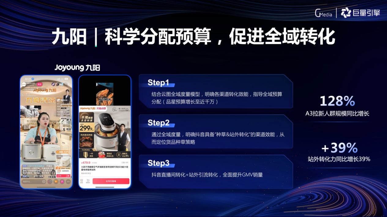 今年618,九陽最 大化發(fā)揮抖種全收的渠道效能,不僅應(yīng)用全域度量產(chǎn)品洞察不同觸點的效率,進行GMV拆解,科學分配預(yù)算,同時錨定藍海品類,優(yōu)化內(nèi)容策略,強化抖音“種草力”。通過抖音直播和站外引流的方式,九陽實現(xiàn)了A3人群拉新規(guī)模同比增長128%,站外轉(zhuǎn)化力同比增長39%,極大帶動了品牌力的規(guī)模、效率、形象提高,實現(xiàn)了全域GMV提升。