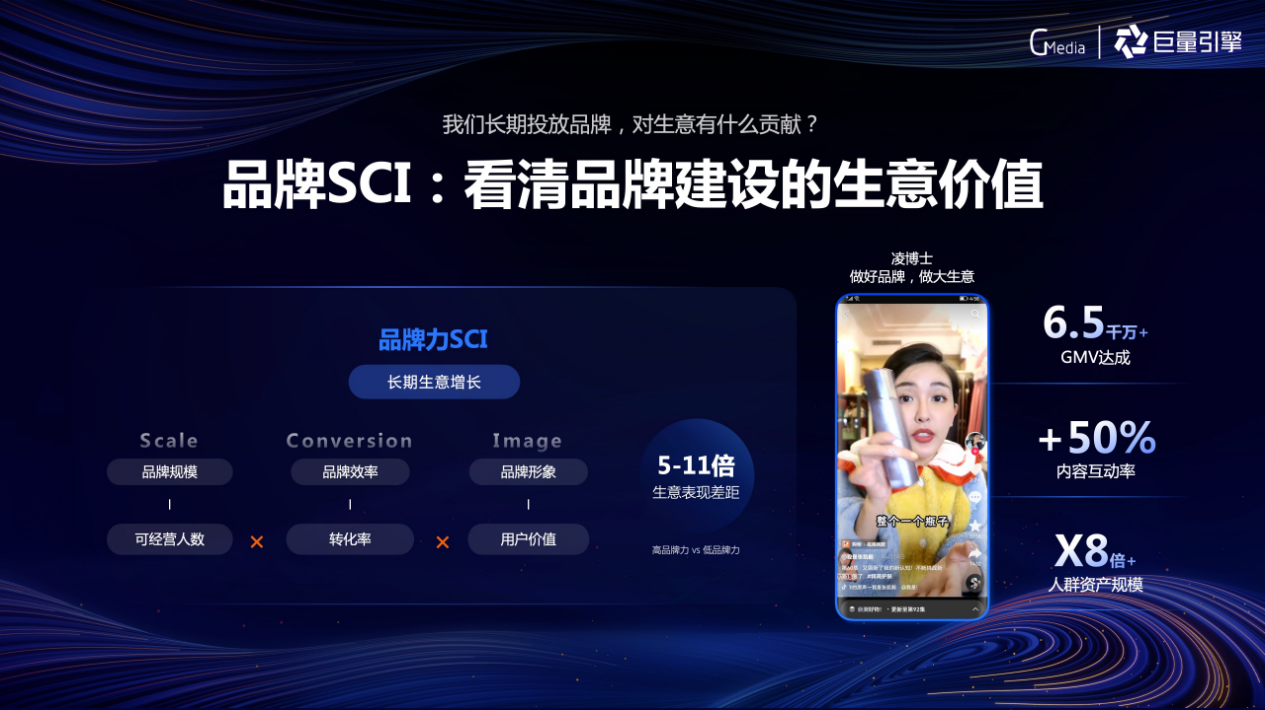 針對這個問題,巨量引擎通過SCI品牌力模型,將無形的品牌力分解為品牌規(guī)模、品牌效率和品牌形象三個要素,通過指標品牌可進行長期GMV的相關(guān)性預(yù)演,真正看清品牌長期建設(shè)與短期生意增長的關(guān)系。通過不同行業(yè)的品牌印證,高品牌力對比低品牌力,在長期生意表現(xiàn)上有5-11倍的差距。