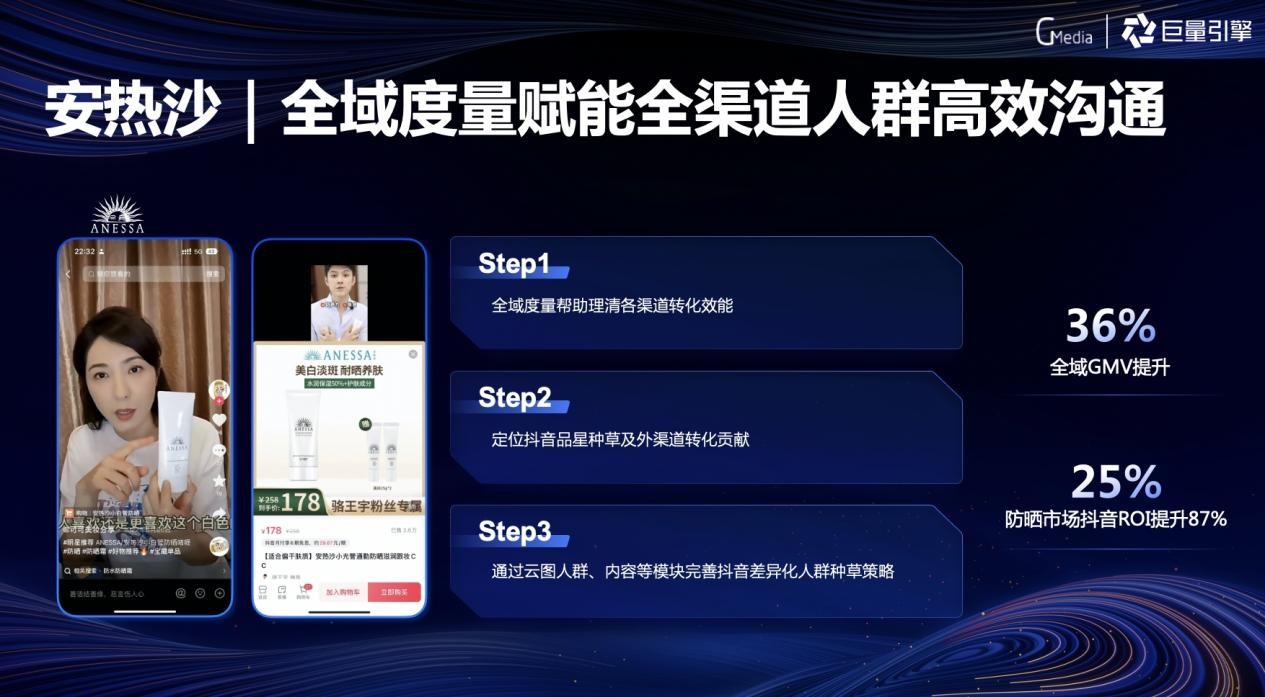 美妝行業(yè)的安熱沙作為防曬品牌頭部品牌,一直以來在多平臺均有生意布局,并觀察到抖音營銷投入對其他平臺生意增長的顯著外溢價值。今年618,安熱沙力求厘清在此前度量體系中忽視的外溢價值,深度運用全域度量模塊和增效洞察模塊,研究抖音品星種草以及外渠道的轉(zhuǎn)化貢獻,從而科學制定抖音差異化人群種草策略。最終,安熱沙全域GMV提升36%,抖音的ROI提升25%。